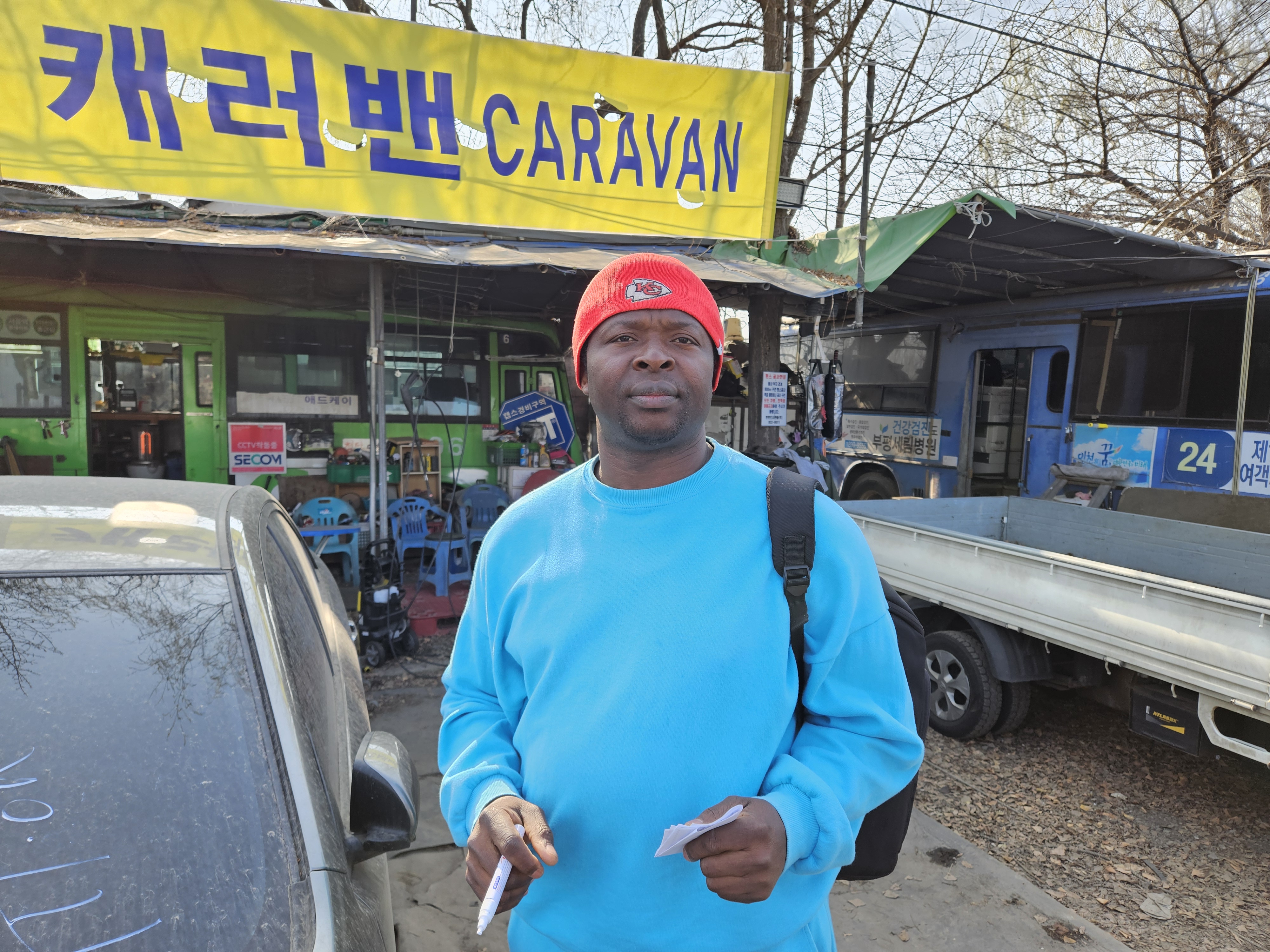 검은색 백팩을 메고 빨간 비니에 터키블루의 트레이닝에 얼룩무늬 방한화를 신은 덩치 큰 친구가 차량에 대해 물어봅니다.